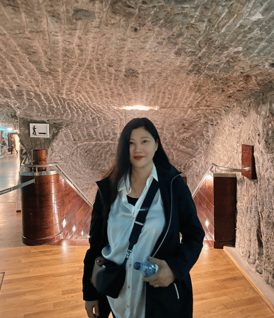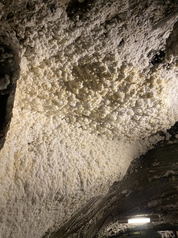 我與我的大女兒從維利奇卡鹽礦礦入口進入。因為維利奇卡鹽礦不能夠自行參觀,要等待維利奇卡鹽礦 “官方導遊”帶隊。每一個官方導遊帶領一組人,官方導遊之間有聯繫控制,以確保人數以及地底氧氣流通。從維利奇卡鹽礦進入,每個人按造順序經由狹小的木製樓梯往下走。“真不知道走了多少階梯(根據官方導遊說大約400多個階梯),終於到了其中一層如同採礦的隧道,眼簾看到的就是走到隧道兩側與頭頂上的岩石都佈滿了鹽礦。(下圖)女導遊說可以拿一點點嚐看看,我些微的撥了幾個顆粒,嚐了一下,真的是具有鹽味的岩鹽。