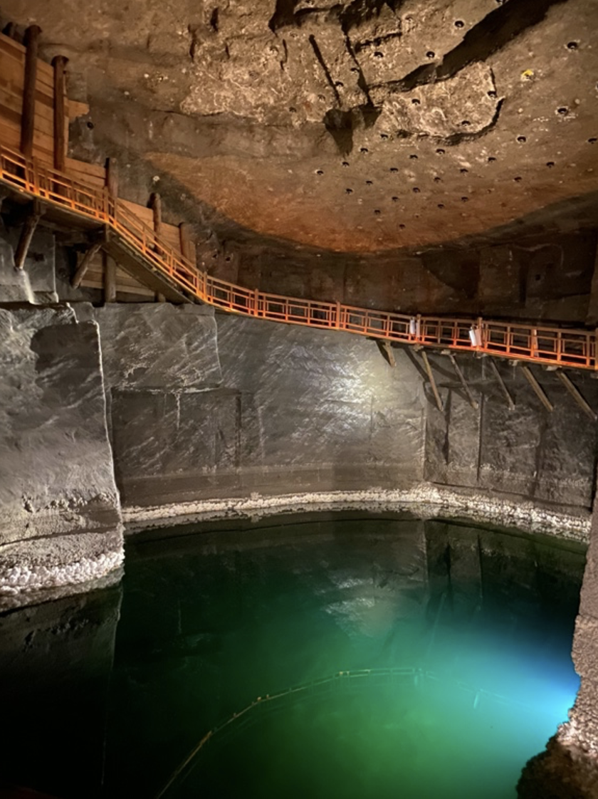 這次在維利奇卡鹽礦的參觀過程,有一個很特別的音樂環節,也就是波蘭官方導遊讓我們站在地下岩洞的小湖旁,要我們待會注意鹽場的音樂“回音”。首先,藍色水面上方的燈光忽然熄燈,光線從微弱黃燈的照射頓時轉完完全黑暗。緊接著,我們聽到鹽場開始播放交響曲。鹽場官方導遊要我們聆聽交響樂曲在岩洞中的“回音”。當時我們每一個人都專注的把個人耳朵的最大功能開啟。我在黑暗中刻意張開雙眼,試圖想要看到回音的當下是否有任何動靜,我在黑暗當中,看到湖面出現些微的波動,但是因為處於全黑的空間,剛剛的綠色湖面,就完全看不到,必須根據呼面上些微的波動,才能辨識那是剛剛的綠色小湖(下圖)。