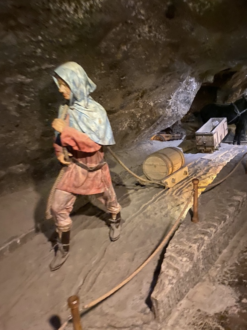 當我看到鹽礦場的鹽工生活,我發現維利奇卡鹽礦場並不是只有男工,其實也有女工在鹽礦場作輔助的工作,從下圖的鹽工圖像,可以看到女工辛勤地拉著木桶在鹽礦隧道行走。可想而知,當時眾多的鹽礦工人需要吃喝,這些都是需要有女工的協助。畢竟開採鹽岩是需要大量的體力活。採礦生活的艱辛,從這裡可以看出部分端倪。